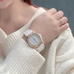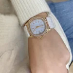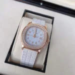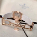 The watch has “Pure White” Embossed Dial w/ Golden hands and Fixed Bezel.