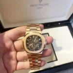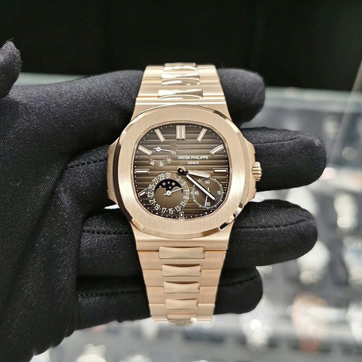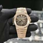 The famous Ref. 5712/1R-001 Nautilus with an analog date, moon phases, and a power-reserve indicator presents sporty appeal and elegance; it features a case and bracelet in rose gold with a brown sunburst dial and a black gradation.