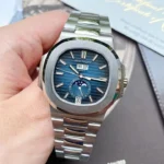 The steel Nautilus, endowed with an Annual Calendar and moon-phase display, now features a new blue dial inspired from the dial color of the original Nautilus model of 1976.