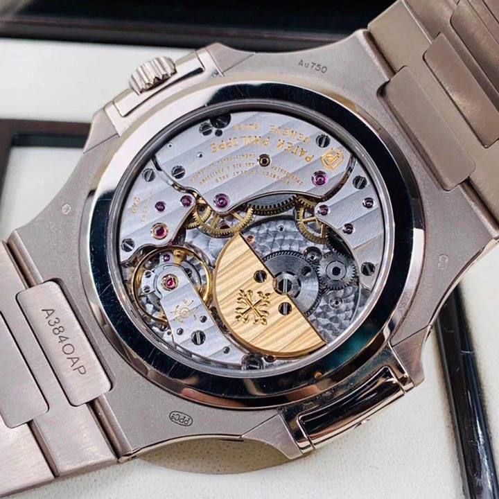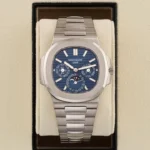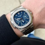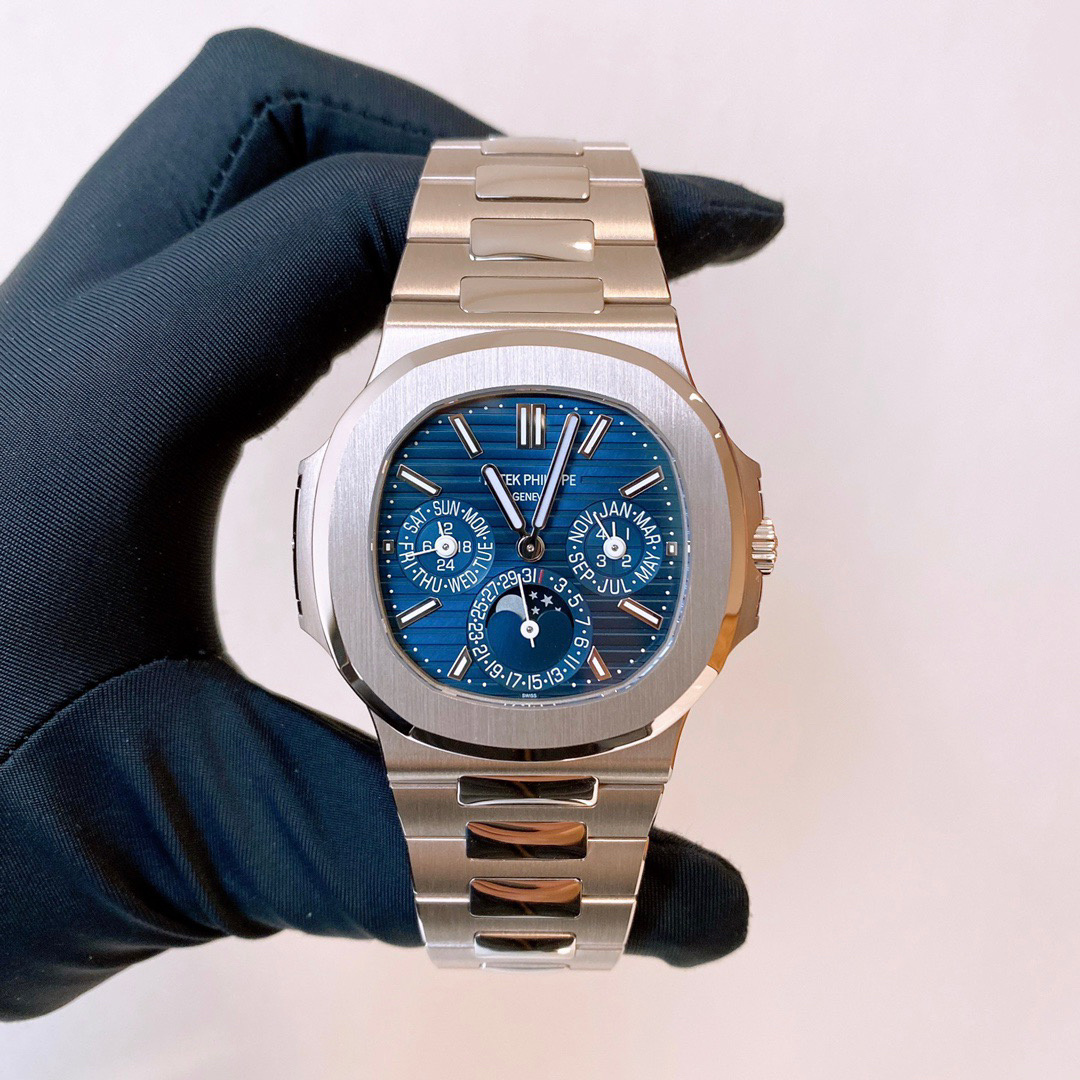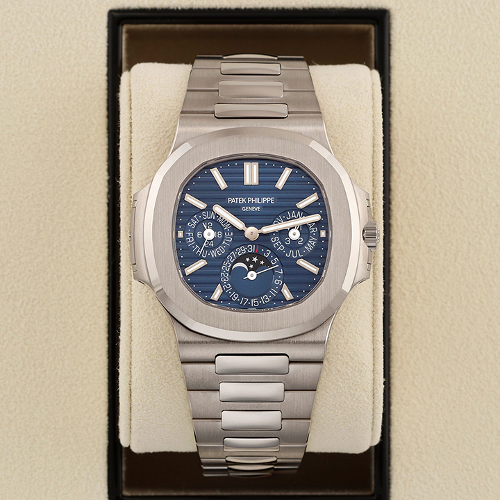 The first Grand Complication in the Nautilus collection, the Reference 5740/1 Nautilus perpetual calendar, offers a distinctive blend of sports appeal and technical sophistication. Thanks to the famous ultra-thin self-winding caliber 240 Q movement, the case (water resistant to 60 m) is remarkably svelte, making this watch Patek Philippe’s thinnest perpetual calendar. The bracelet is equipped with a new fold-over clasp providing optimized security.