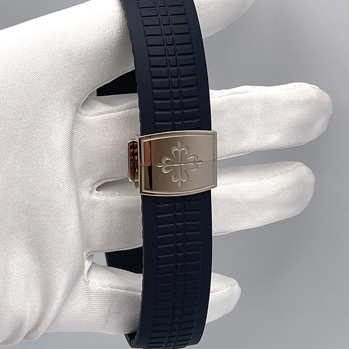 Patek Philippe is reasserting the “contemporary casual chic” spirit of the Aquanaut flyback chronograph with the first white gold version of this self-winding model, combined with an elegant midnight blue color for the dial and matching composite strap. The dial is enlivened by a black-gradient rim. Water-resistant to 120 m, the case is enhanced by polished and satin finishes. The 60-minute counter at 6 o’clock picks up the rounded octagonal shape of the bezel. The patented fold-over clasp is secured by four independent catches.