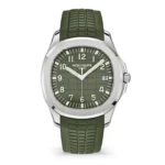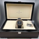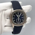 Patek Philippe is reasserting the “contemporary casual chic” spirit of the Aquanaut flyback chronograph with the first white gold version of this self-winding model, combined with an elegant midnight blue color for the dial and matching composite strap. The dial is enlivened by a black-gradient rim. Water-resistant to 120 m, the case is enhanced by polished and satin finishes. The 60-minute counter at 6 o’clock picks up the rounded octagonal shape of the bezel. The patented fold-over clasp is secured by four independent catches.
