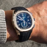 Patek Philippe is reasserting the “contemporary casual chic” spirit of the Aquanaut flyback chronograph with the first white gold version of this self-winding model, combined with an elegant midnight blue color for the dial and matching composite strap. The dial is enlivened by a black-gradient rim. Water-resistant to 120 m, the case is enhanced by polished and satin finishes. The 60-minute counter at 6 o’clock picks up the rounded octagonal shape of the bezel. The patented fold-over clasp is secured by four independent catches.