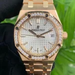 Audemars Piguet launches its first 34 mm Selfwinding Royal Oak. The silver-toned “Grande Tapisserie” dial of this 18-carat pink gold model is adorned with a diamond-set bezel.