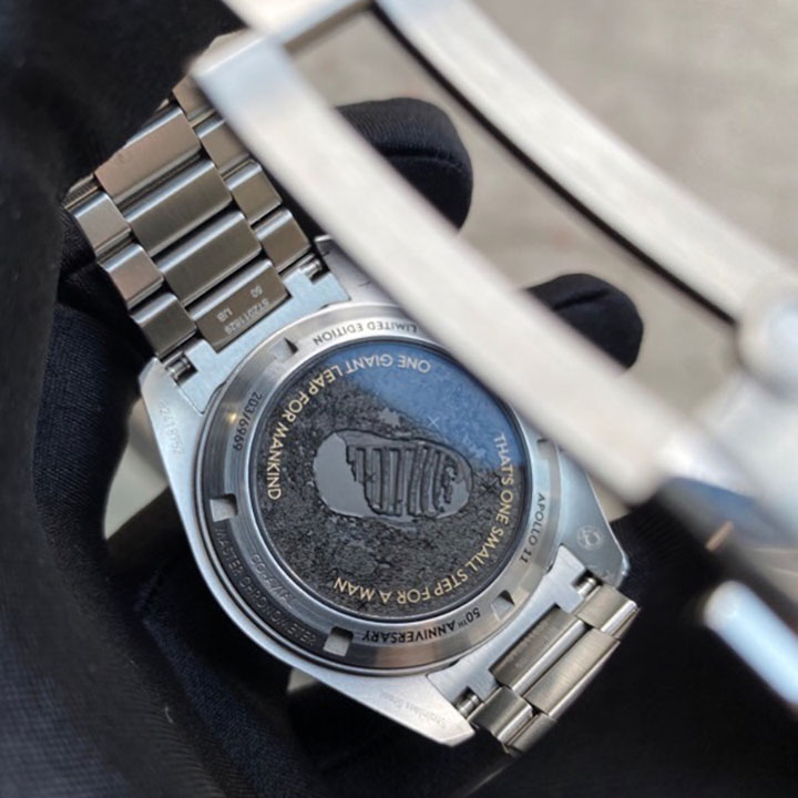 The NAIAD LOCK caseback reveals numerous engravings, while a laser-engraved image of Buzz Aldrin’s footprint is positioned on a medallion under the sapphire crystal. 18K Moonshine™ Gold-plated lettering includes the quote: “THAT’S ONE SMALL STEP FOR A MAN” and “ONE GIANT LEAP FOR MANKIND”.