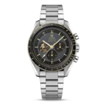 The watch includes a 42 mm case in stainless steel with a polished 18K Moonshine™ Gold bezel. The bezel ring is polished black ceramic [ZrO2] with an OMEGA Ceragold™ tachymeter scale. There is a varnished grey and black dial with all indexes and hands in 18K Moonshine™ Gold – except the central chronograph seconds hand, which is PVD-coated in Moonshine Gold. A unique hour marker is positioned at 11 o’clock, and there is a distinctive 9 o’clock subdial in 18K Moonshine™ Gold with a laser-engraved image of Buzz Aldrin climbing down onto the lunar surface.