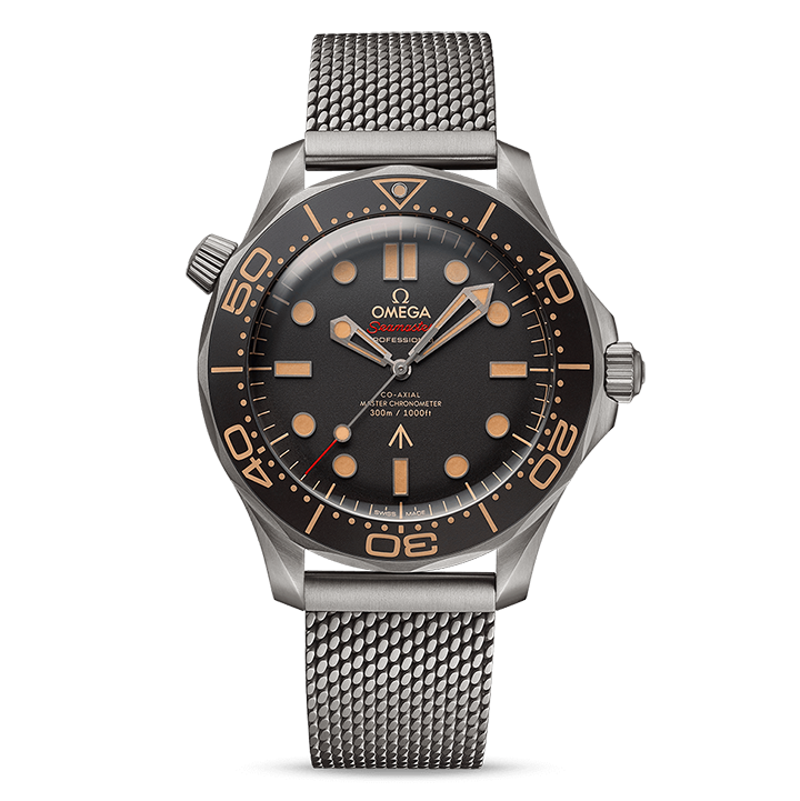 Identical to 007’s watch in No Time To Die this 42mm Seamaster, in strong yet lightweight Grade 2 Titanium, sports a brown tropical aluminium bezel ring and dial.
