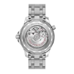 This 42 mm model is crafted from stainless steel and includes a black ceramic bezel with a white enamel diving scale. The dial is also polished black ceramic and features laser-engraved waves and a date window at 6 o’clock.