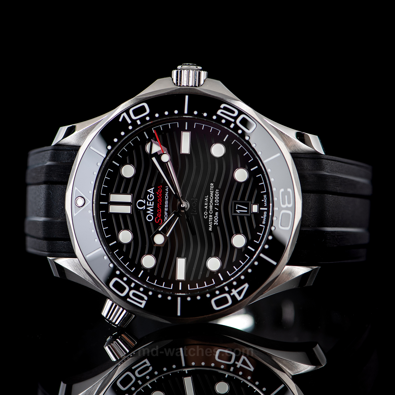 The watch is presented on a black rubber strap and is driven by the OMEGA Master Chronometer Calibre 8800,