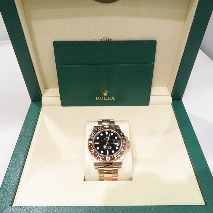 This model features a black dial and a two-colour Cerachrom bezel insert in brown and black ceramic. Designed to show the time in two different time zones simultaneously during intercontinental flights, the GMT-Master II has come to be recognized for its robustness and versatile appearance.
