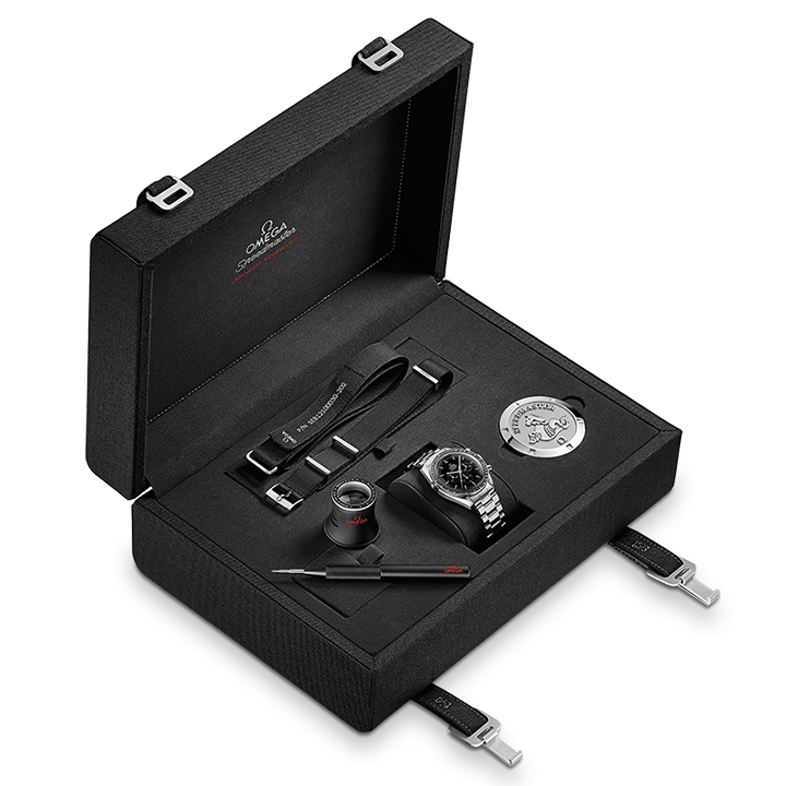 At the heart of this chronograph is OMEGA’s mechanical calibre 1863, a descendent of the legendary manual-winding movement worn on the Moon, visible through the transparent caseback. This timepiece is offered with a special Moonwatch presentation box which contains a “NATO” strap, a strap for astronauts, a tool to change the bracelet and a book highlighting Speedmaster’s adventures.
