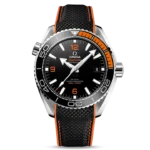 This model, with its scratch-resistant sapphire crystal, features a polished black ceramic dial with Arabic numerals and a date window at the 3 o’clock position. Mounted on the 43.5 mm stainless steel case, is the world’s premiere black ceramic bezel with orange rubber. The diving scale of the bezel is crafted with Liquidmetal™.