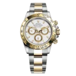 THIS OYSTER PERPETUAL COSMOGRAPH DAYTONA IN OYSTERSTEEL AND YELLOW GOLD, WITH A WHITE DIAL AND AN OYSTER BRACELET, FEATURES A YELLOW GOLD BEZEL WITH ENGRAVED TACHYMETRIC SCALE.