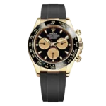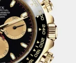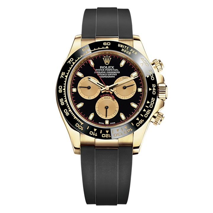 THIS OYSTER PERPETUAL COSMOGRAPH DAYTONA IN 18 KT YELLOW GOLD WITH AN INTENSE BLACK AND CHAMPAGNE-COLOUR DIAL AND AN OYSTERFLEX BRACELET, FEATURES A BLACK CERACHROM BEZEL WITH TACHYMETRIC SCALE.