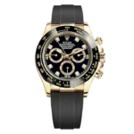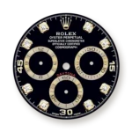 THIS OYSTER PERPETUAL COSMOGRAPH DAYTONA IN 18 CT YELLOW GOLD WITH A BLACK, DIAMOND-SET DIAL AND AN OYSTERFLEX BRACELET, FEATURES A BLACK CERACHROM BEZEL WITH TACHYMETRIC SCALE.