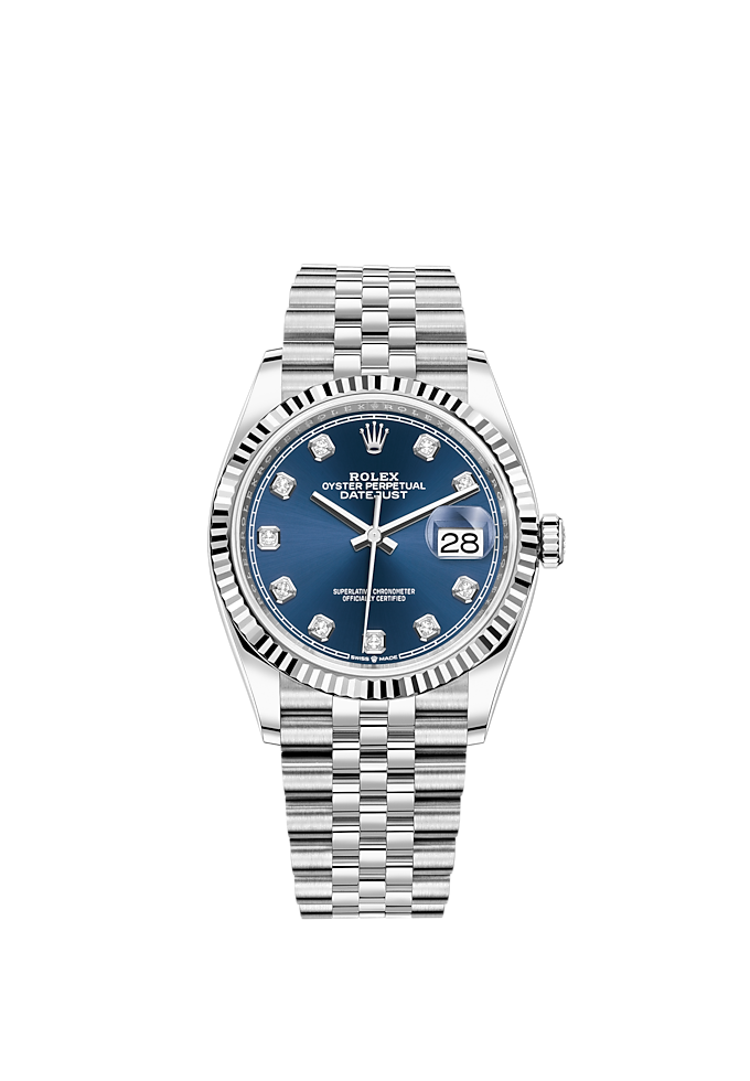 THIS OYSTER PERPETUAL DATEJUST 36 IN OYSTERSTEEL AND WHITE GOLD FEATURES A BRIGHT BLUE, DIAMOND-SET DIAL AND A JUBILEE BRACELET.
