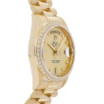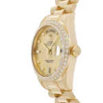 Pre-Owned Rolex Day-Date (18348) self – winding automatic watch, features a 36mm 18k yellow gold case with a diamond bezel surrounding a champagne diamond dial on an 18k yellow gold President bracelet with folding buckle. Functions include hours, minutes, seconds, day and date.