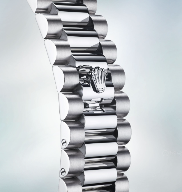 The design, development and production of Rolex bracelets and clasps, as well as the stringent tests they face, involve advanced high technology. And, as with all the components of the watch, aesthetic controls by the human eye guarantee impeccable beauty. The President bracelet, with its semi-circular three piece links, was created in 1956 for the launch of the Oyster Perpetual Day-Date. It represents the ultimate in refinement and comfort and is always made of carefully selected precious metals.