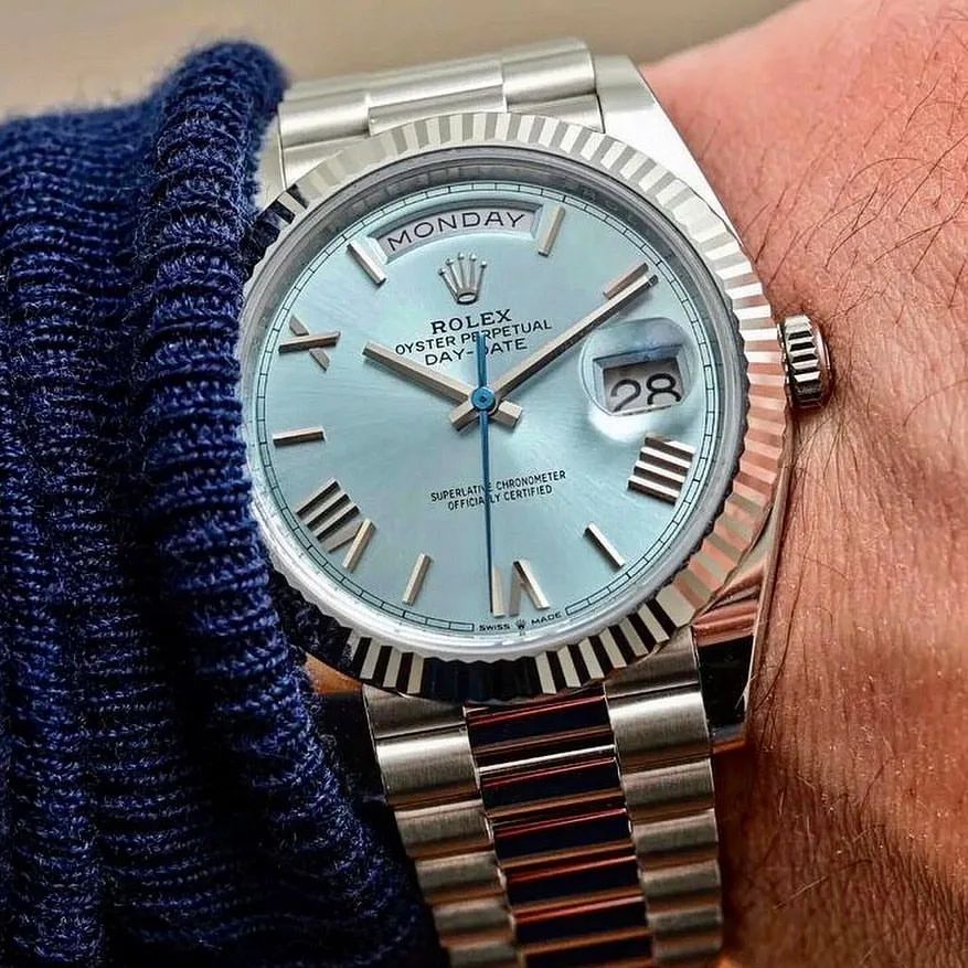 The dawn of a new day. The platinum Day-Date 40 featuring an ice-blue dial with faceted Roman numerals, fluted bezel, and fitted with the President bracelet.