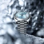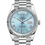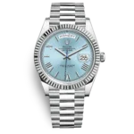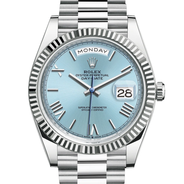 The dawn of a new day. The platinum Day-Date 40 featuring an ice-blue dial with faceted Roman numerals, fluted bezel, and fitted with the President bracelet.