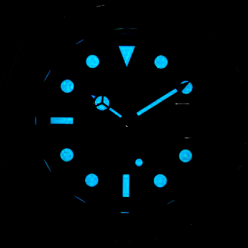 The broad hands and hour markers in simple shapes – triangles, circles, rectangles – are filled with a luminescent material emitting a long-lasting glow.