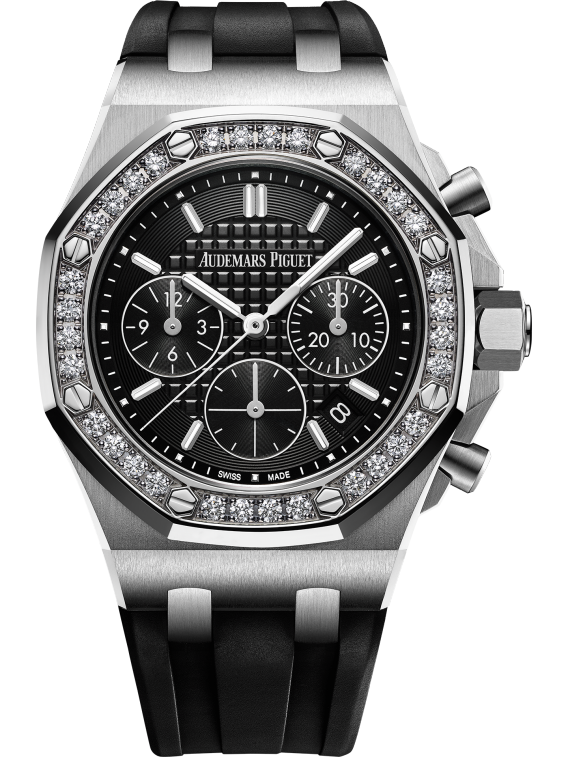 Combining a diamond-set bezel, a stainless steel case and a rubber strap,