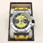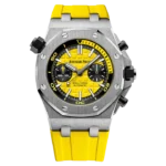 A summery bright yellow Oak Offshore. Blatant, refreshing, funky. Featuring the selfwinding Manufacture caliber 3124/3841 with a power reserve of 50 hours, 59 jewels and 21,600 vibrations/hour fitted into a 42 mm stainless steel case with sapphire crystal open caseback.