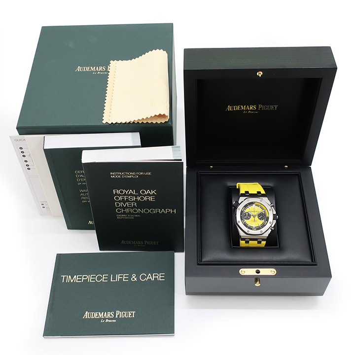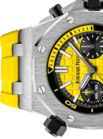 Yellow dial with “Méga Tapisserie” pattern, black counters, blackened gold applied hour-markers and Royal Oak hands with luminescent coating, black rotating inner bezel with diving scale and zone from 60 to 15 minutes in yellow.