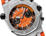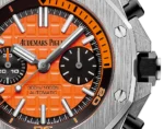 Orange dial with “Méga Tapisserie” pattern, black counters, blackened gold applied hour-markers and Royal Oak hands with luminescent coating, black rotating inner bezel with diving scale and zone from 60 to 15 minutes in orange.