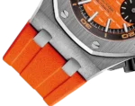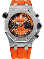 A vibrant Royal Oak Offshore, featuring the original collection trademark design elements and innovative functions. The Royal Oak Offshore Diver Chronograph, an encounter between twho masterstokes: the Diver and the Chronograph. Water-resistant up to 300 meters, the watch features a rotating inner bezel color-blocked with diving scale and zone, subsidiary seconds and 30-minute register.