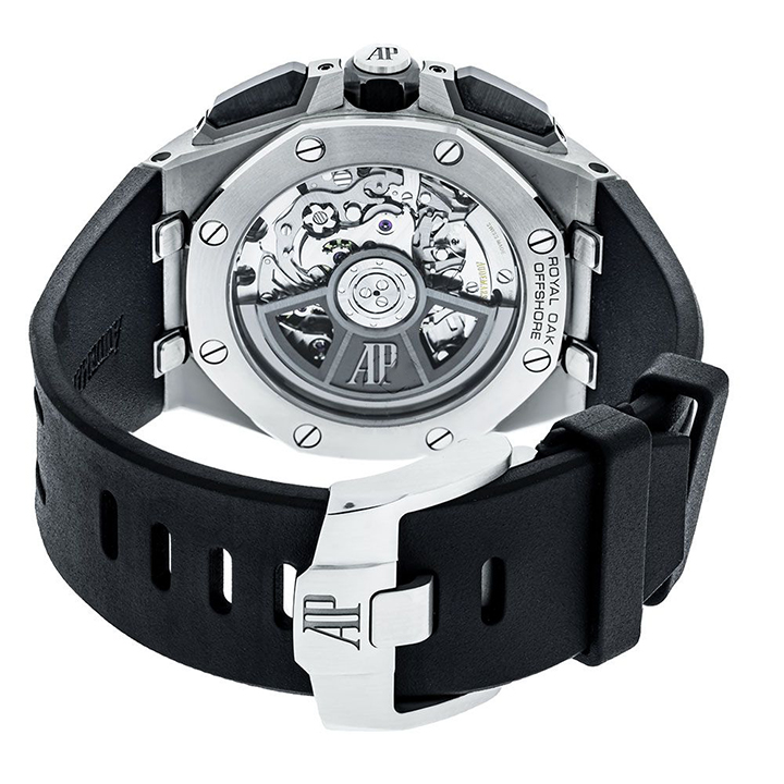 Black rubber strap with stainless steel AP pin buckle and interchangeable strap system. Additional brown calfskin strap