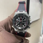 A watch made for adventure. Black with a hint of red to accentuate the chronograph functions and strap. It features a typical combination of stainless steel, ceramic and rubber, typical of the Royal Oak Offshore.