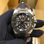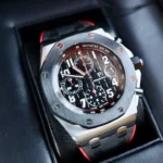 A watch made for adventure. Black with a hint of red to accentuate the chronograph functions and strap. It features a typical combination of stainless steel, ceramic and rubber, typical of the Royal Oak Offshore.