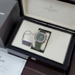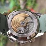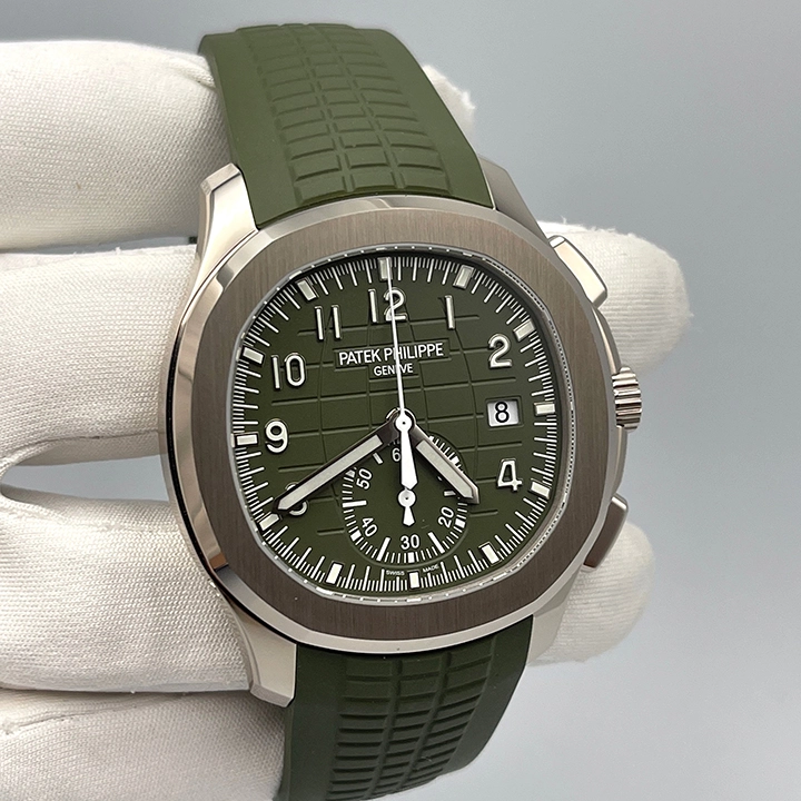 Patek Philippe is reasserting the “contemporary casual chic” spirit of the Aquanaut flyback chronograph with the first white gold version of this self-winding model, combined with a bold khaki-green color for the dial and matching composite strap. Water-resistant to 120 m, the case is enhanced by polished and satin finishes. The 60-minute counter at 6 o’clock picks up the rounded octagonal shape of the bezel. The patented fold-over clasp is secured by four independent catches.