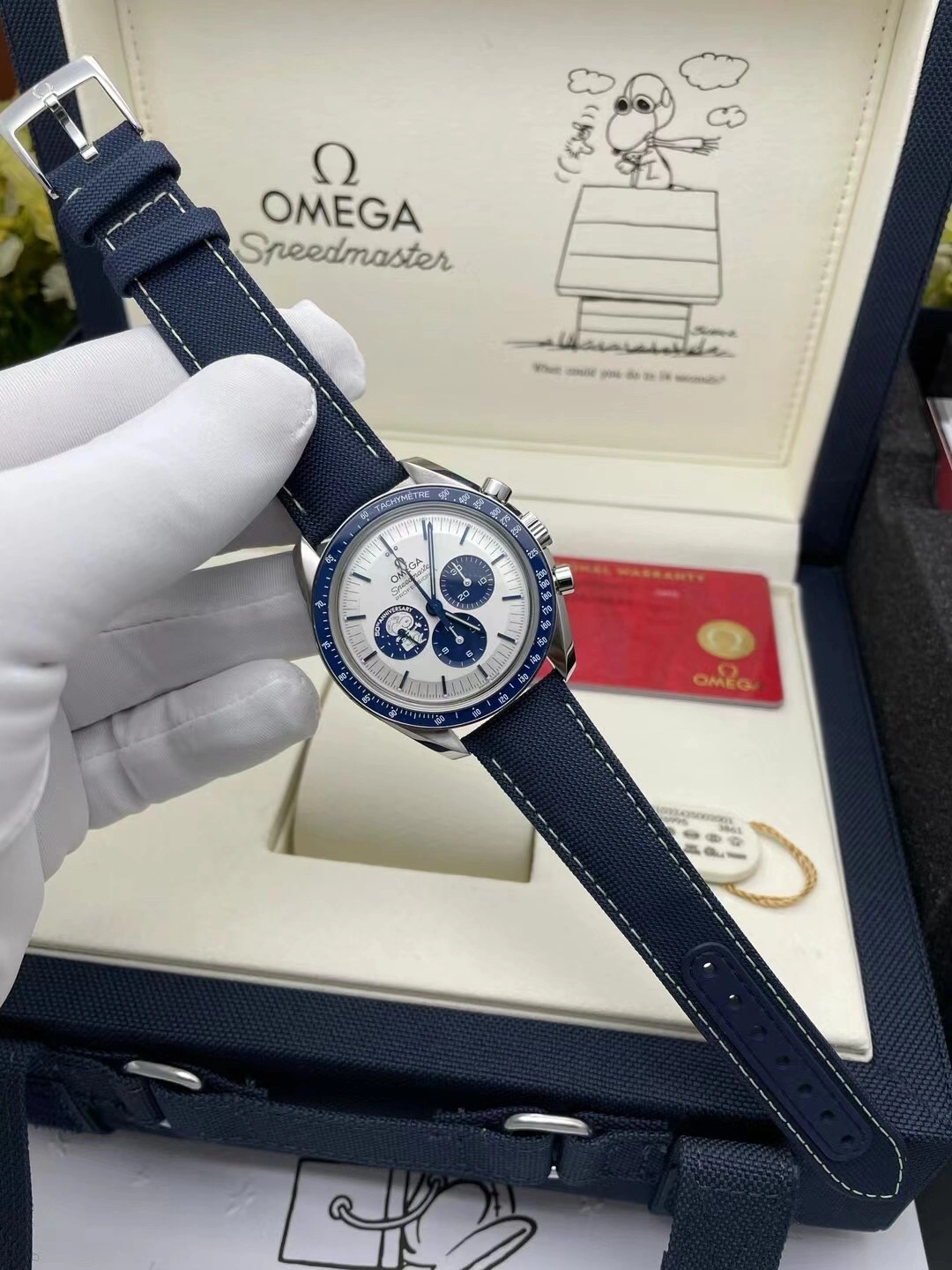 The 42 mm case in stainless steel is presented on a blue nylon fabric strap, which features the trajectory of the Apollo 13 mission on the embossed lining. The silver dial has blue PVD angle-shaped hour markers and hands, as well as an embossed silver Snoopy medallion on the blue subdial at 9 o’clock.